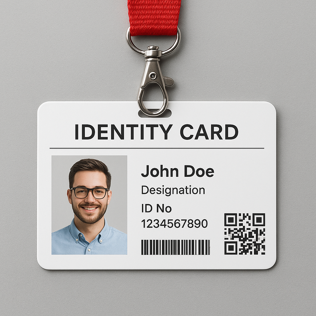 An identity card is a small, portable card issued by an institution, organization, or authority that contains essential details about the person or entity it represents. It usually carries the person’s name, photograph, designation, and unique information such as ID number, barcode, or QR code.